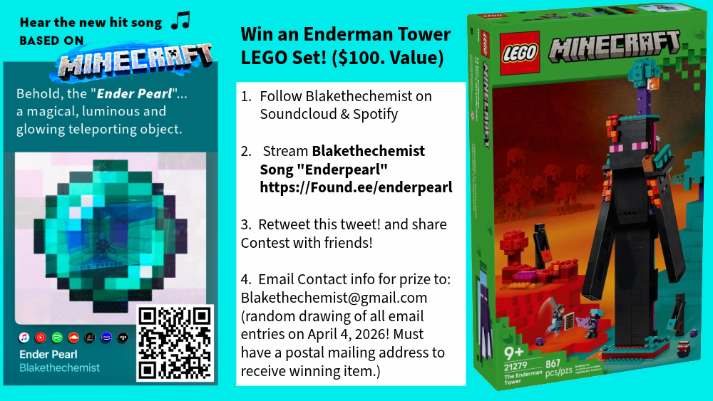 Enter the Blakethechemist “EnderPearl” Dance Song Contest to win a Lego Enderman Tower building set ($100. Value) Contest Runs: February 2026 - April 4, 2026